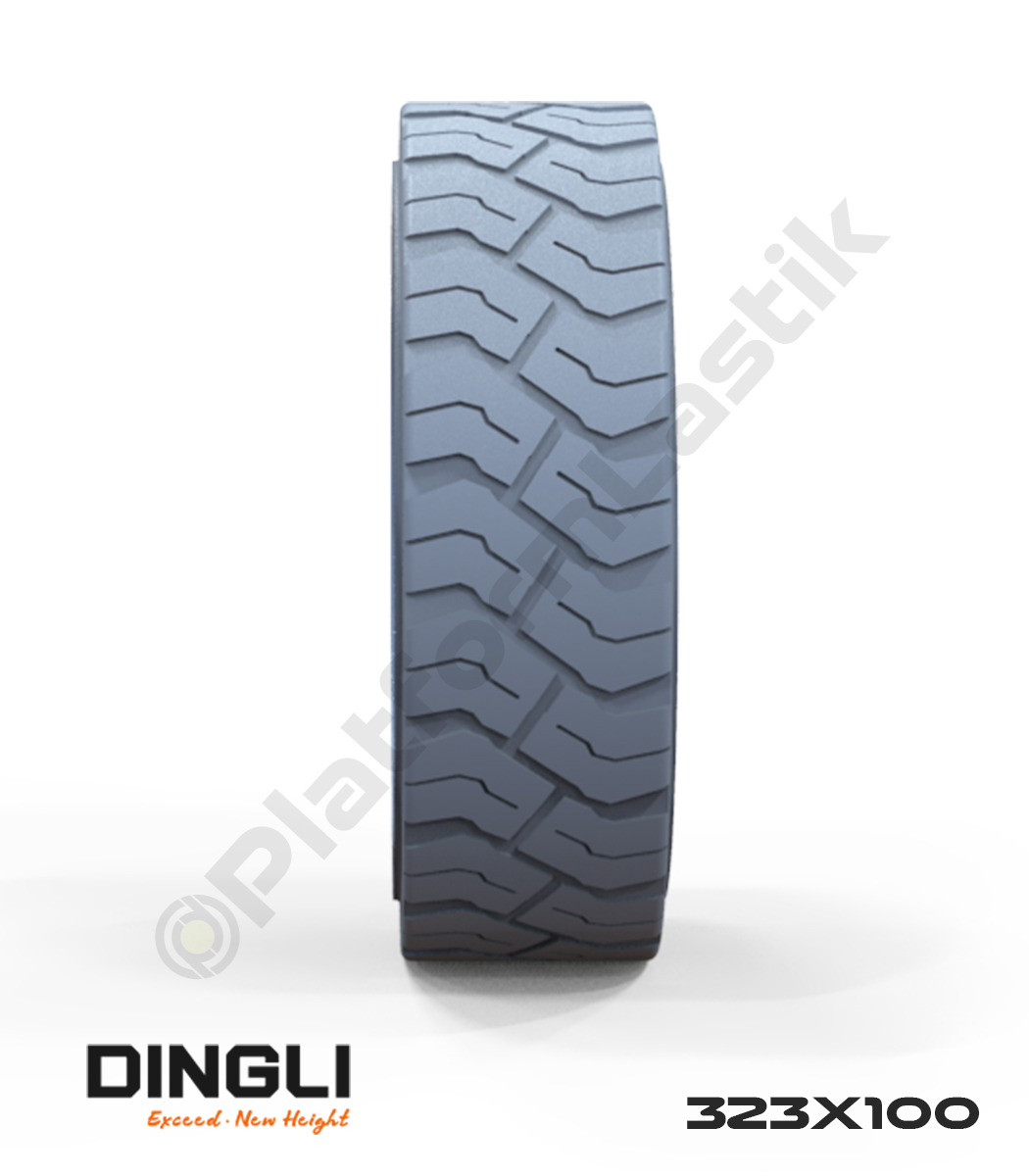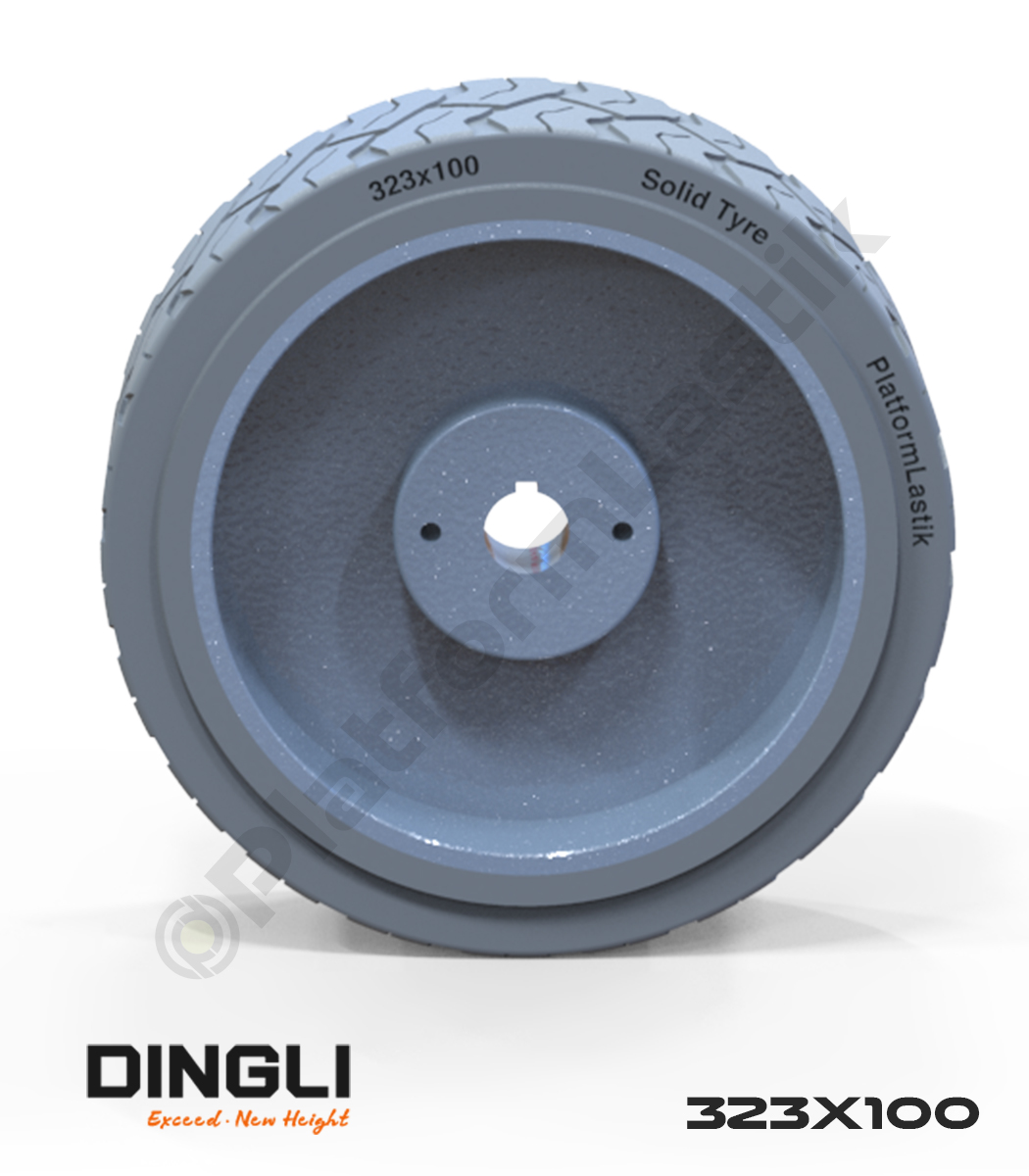 Dingli 323×100 iz bırakmayan gri kauçuk makaslı platform tekerleği, dengeli sürüş, yüksek aşınma direnci ve endüstriyel zeminlerde güvenli kullanım sağlar.