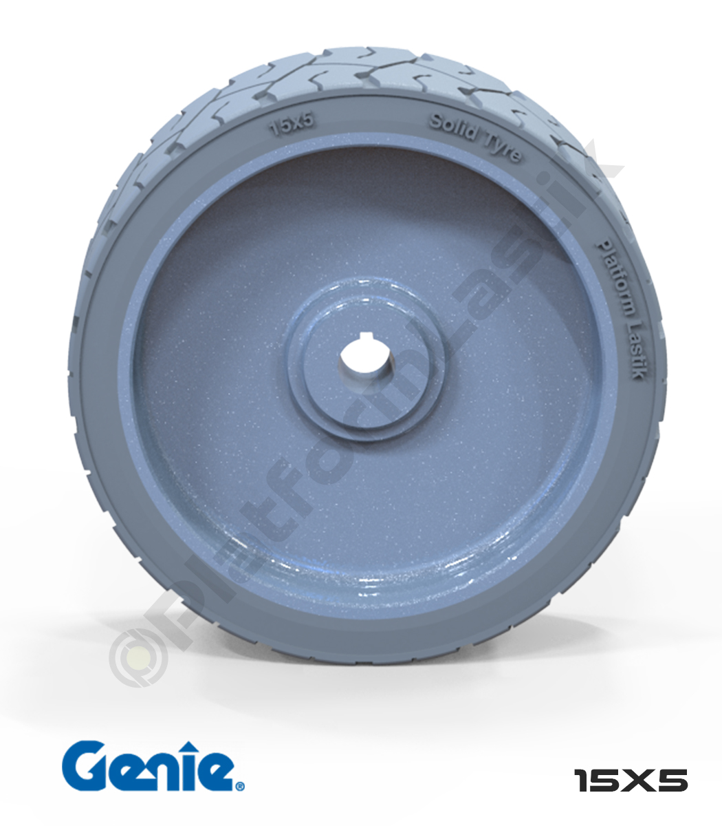 Genie 15×5 iz bırakmayan gri kauçuk makaslı platform tekerleği, ağır yüklerde yüksek stabilite, güçlü çekiş ve uzun servis ömrü sunar.