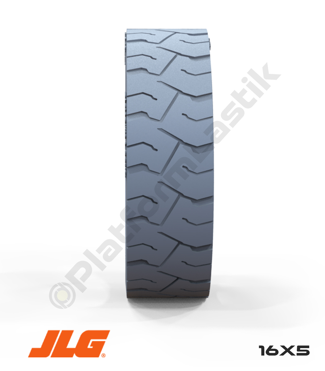 JLG 16×5 iz bırakmayan gri kauçuk makaslı platform tekerleği, yüksek stabilite, güçlü çekiş ve düşük aşınma oranıyla profesyonel kullanımlar için idealdir, uzun ömürlü performans sunar.
