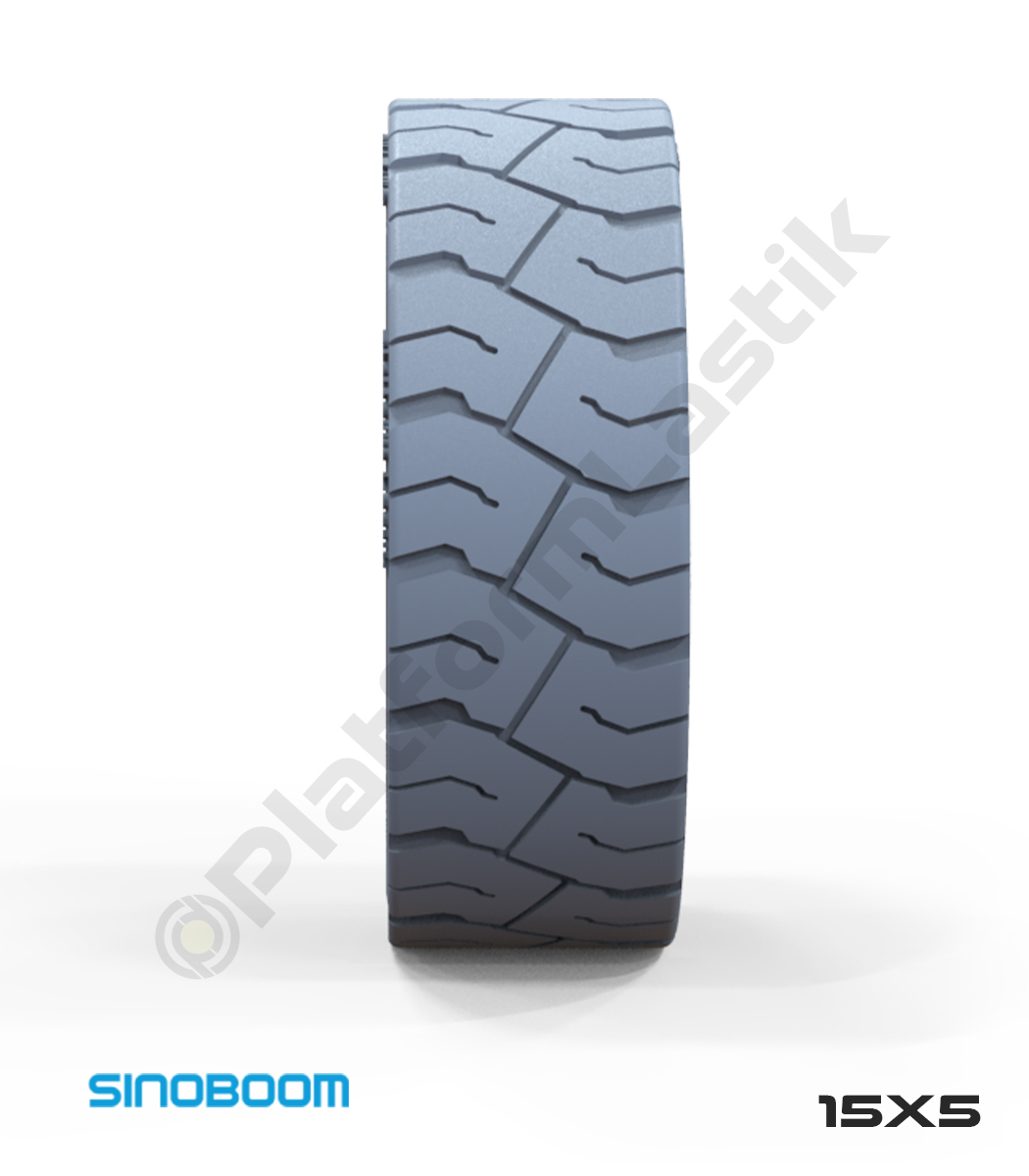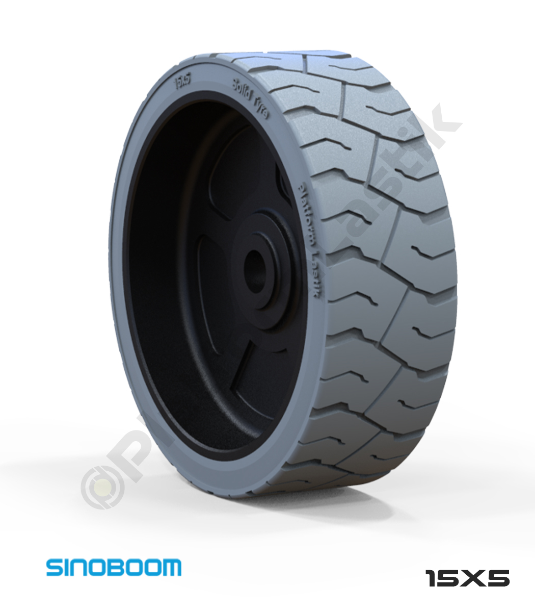 Sinoboom 15×5 iz bırakmayan gri kauçuk makaslı platform tekerleği, yoğun çalışma şartlarında dengeli sürüş, zemin koruması ve yüksek dayanıklılık sağlar, uzun süreli güvenli kullanım sunar.