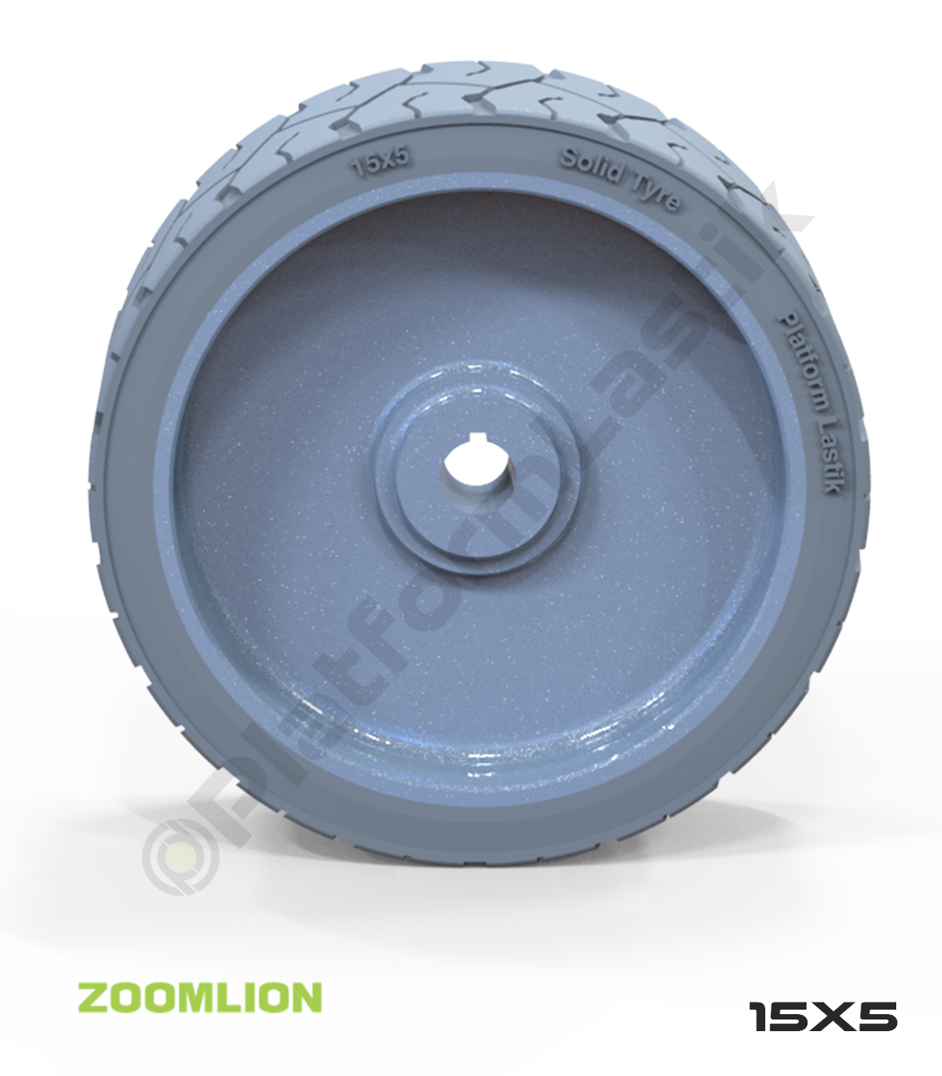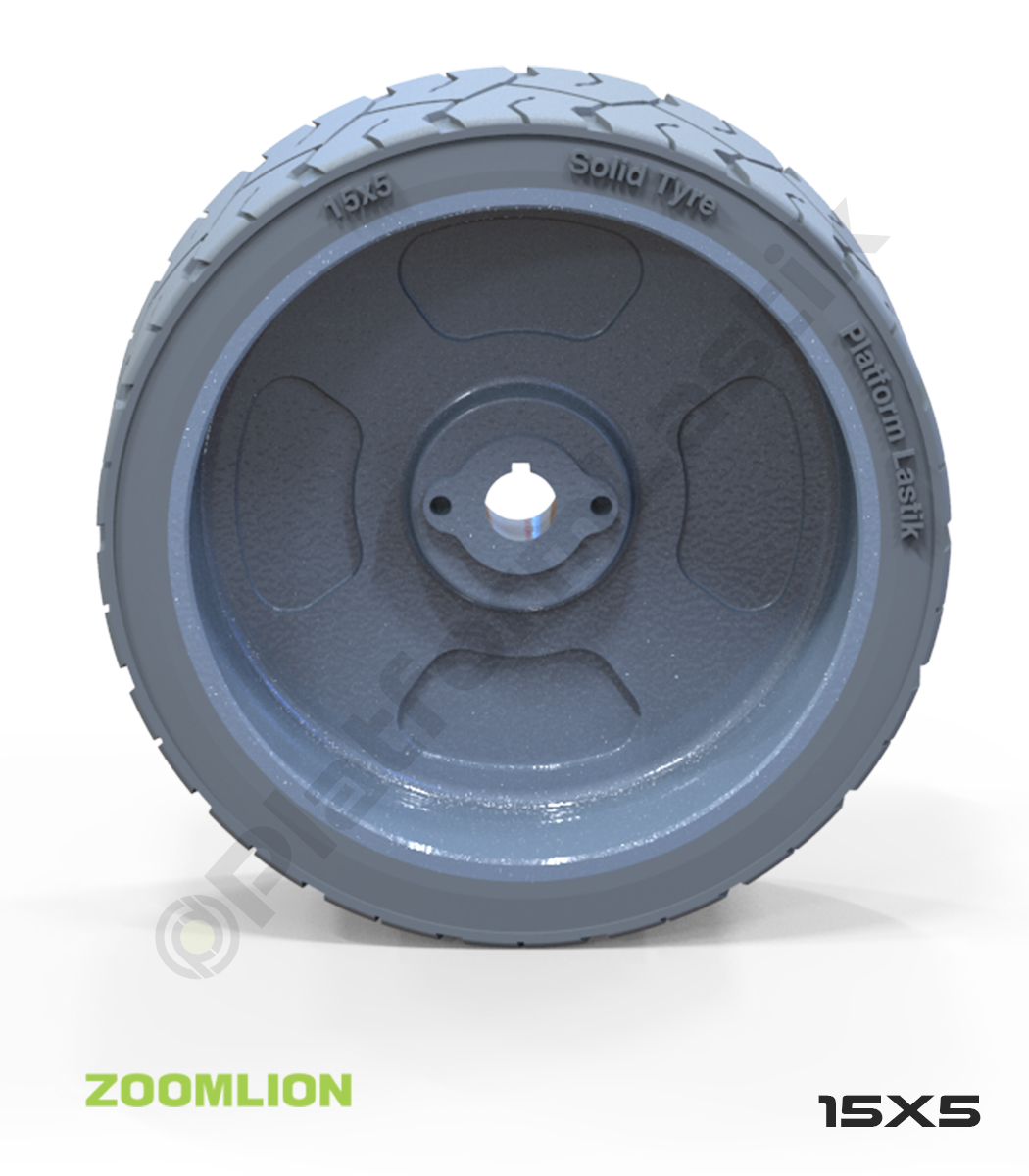 Zoomlion 15×5 iz bırakmayan gri kauçuk makaslı platform tekerleği, dış ve iç mekanlarda dengeli sürüş, sağlam yapı ve uzun kullanım ömrü sunar.