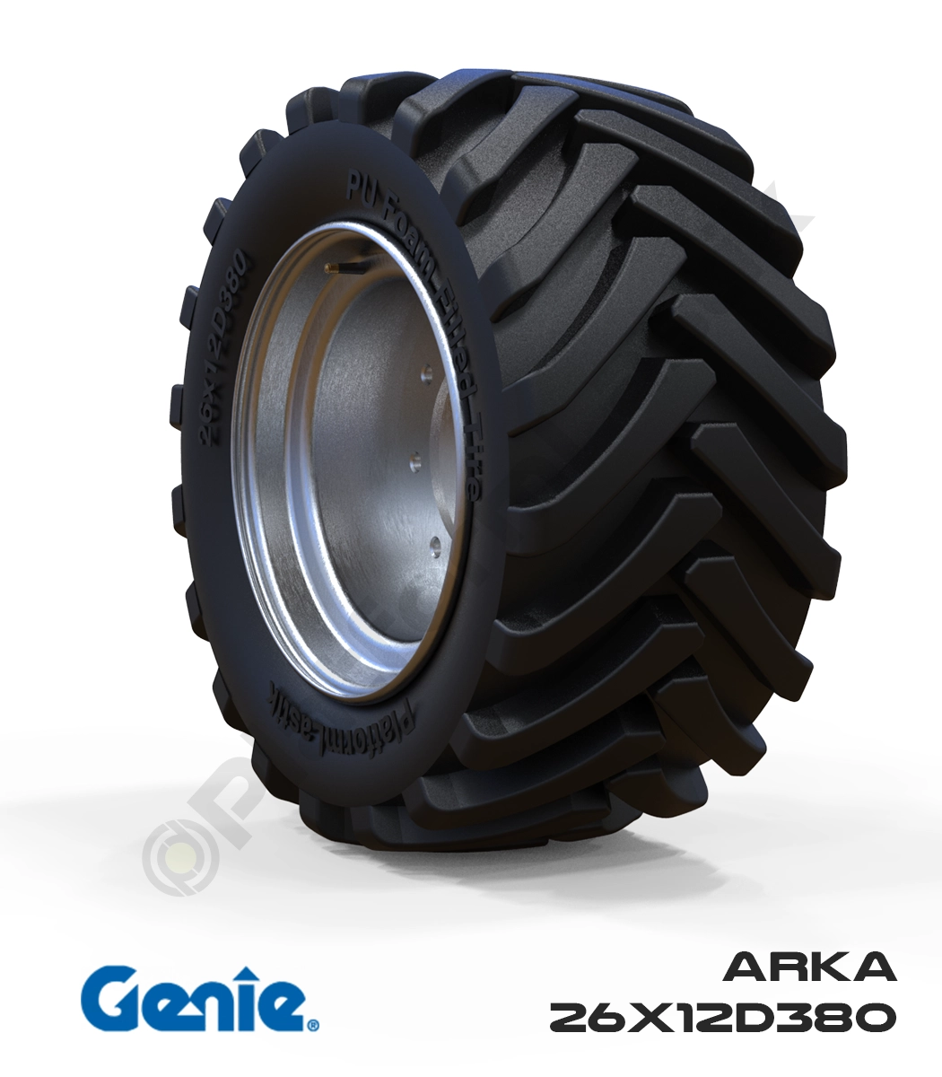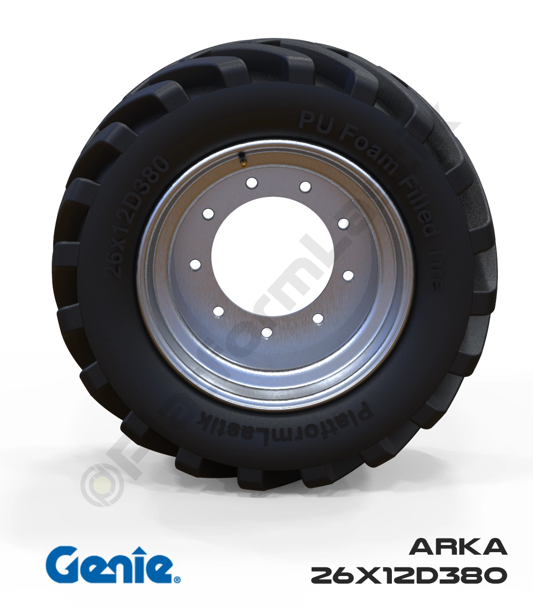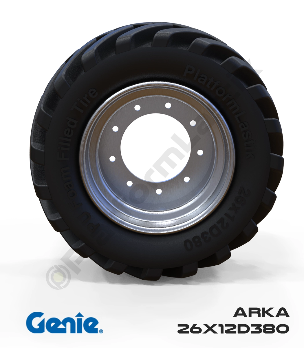 Genie arka aks uyumlu 26x12D380 tekerlek, PU köpük jel dolgusu ile sahada asla yarı yolda bırakmaz. Geniş taban yapısı sayesinde ağırlığı zemine eşit dağıtarak dengeyi artırır. Siyah dış yüzeyi aşınmaya karşı yüksek direnç gösterirken, dolgu teknolojisi sayesinde lastik patlamalarından kaynaklanan iş kayıplarını ve maliyetli bakım süreçlerini tamamen sonlandırır.