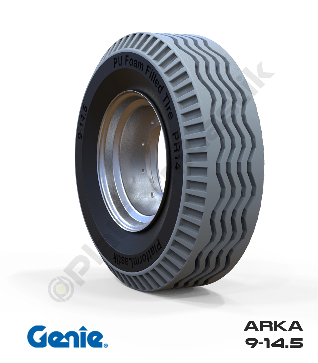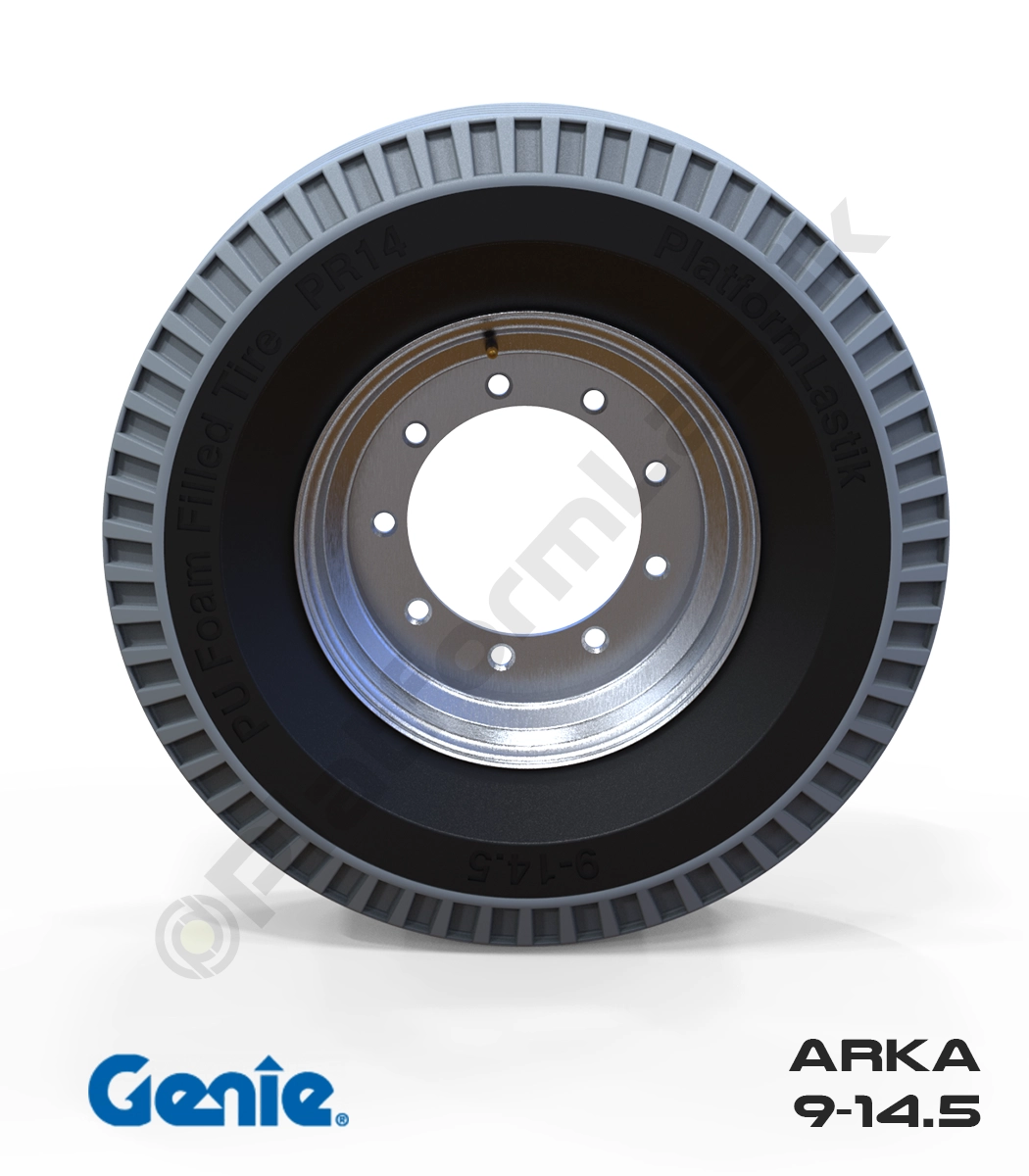 Genie eklemli platformların arka aksı için tasarlanan 9-14.5 tekerlek, iz bırakmayan gri yapısı ve PU köpük jel dolgusuyla dikkat çeker. Delinmelere karşı tam koruma sağlayan bu teknoloji, iç mekan operasyonlarında zemin temizliğini korurken, dış saha çalışmalarında kesintisiz hareket kabiliyeti ve maksimum sürüş stabilitesi sunar.