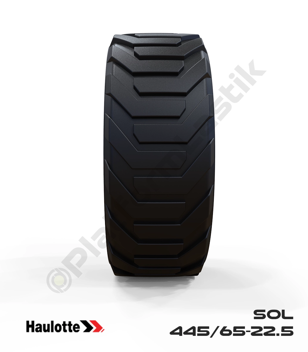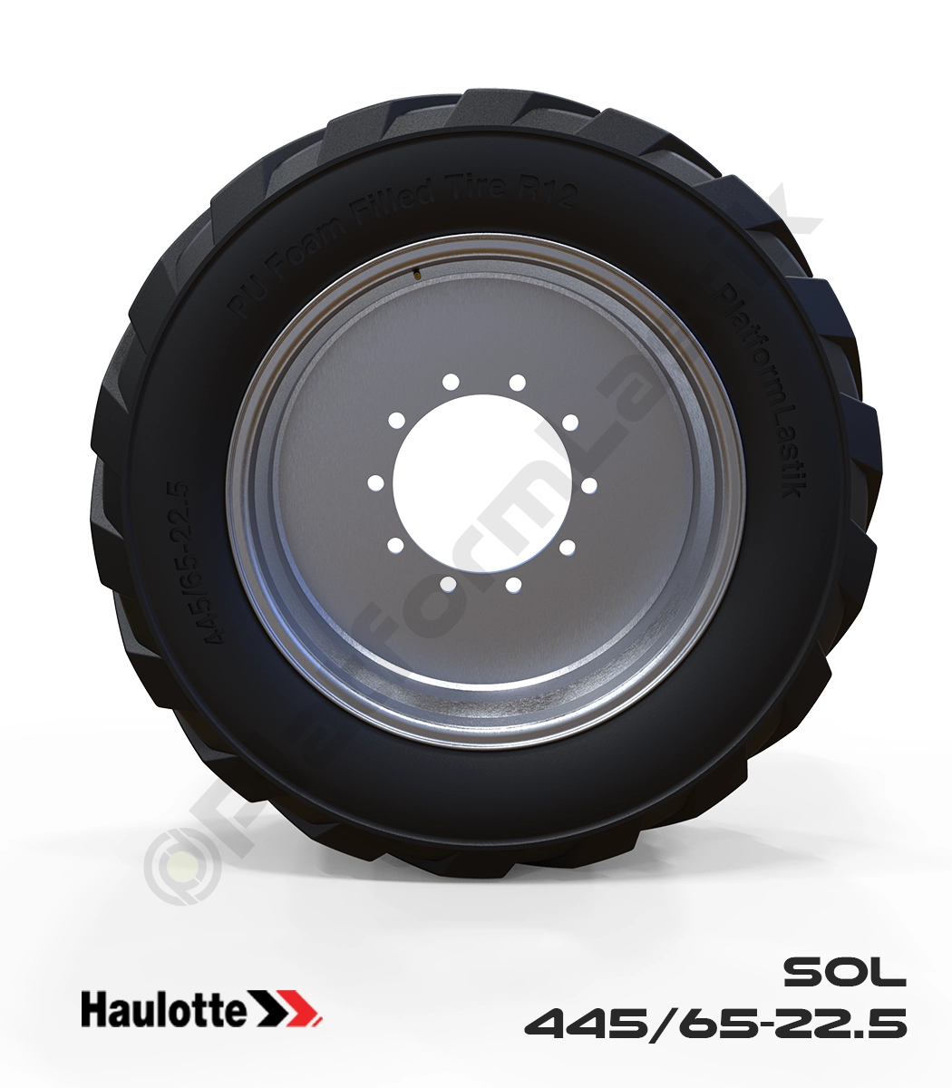 Haulotte teleskopik modellerin sol tarafı için tasarlanan 445/65-22.5 tekerlek, siyah dış yüzeyi ve PU köpük jel dolgusuyla ağır hizmet tipi kullanım sunar. Kesici nesnelerin bulunduğu şantiyelerde patlama riskini ortadan kaldırır. Yüksek taşıma kapasitesi ve dayanıklı jant yapısı, makinenin en yüksek noktalarda dahi maksimum stabiliteyle çalışmasını garanti altına alır.