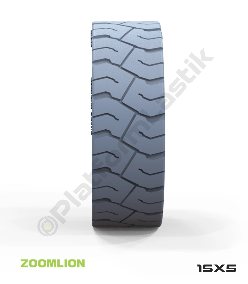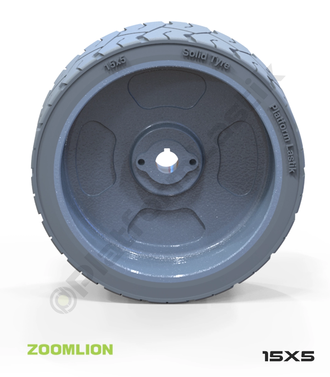 Zoomlion ekipmanları için geliştirilen 15×5 iz bırakmayan gri kauçuk tekerlek, ağır hizmet tipi yapısıyla dikkat çeker. Endüstriyel tesislerde ve depolama alanlarında zemine zarar vermeden hareket etmeyi mümkün kılar. Optimum sertlik derecesi ile hem aşınma direncini artırır hem de platformun dengesini korur.